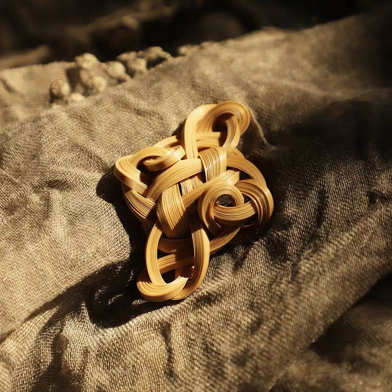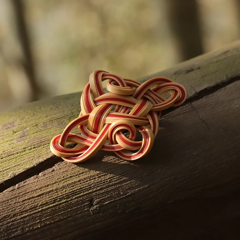Inspired by the traditional Chinese Ruyi Knot, this bamboo brooch is carefully handwoven from natural bamboo strips, blending warm beige and red tones that symbolize prosperity and joy. The intricate knot design represents good fortune, harmony, and longevity, making it not just an accessory but a meaningful piece of wearable art.