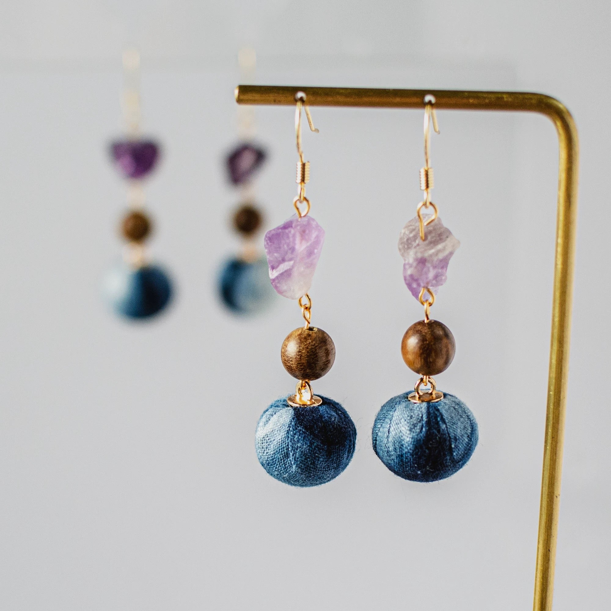 Indigo Tie-Dye Fabric Earrings with Amethyst & Wood